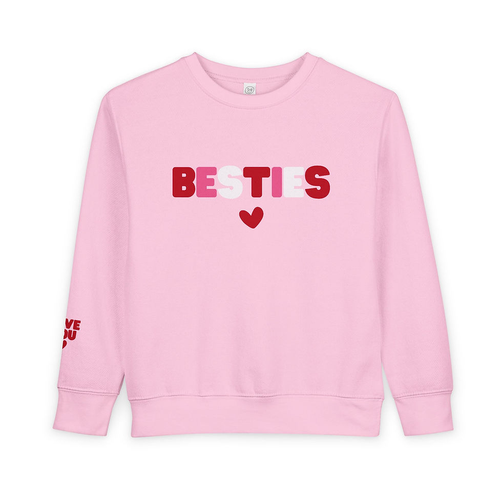 A cozy youth crewneck sweatshirt with a cheerful, hand-lettered "BESTIES" across the chest and a small heart beneath. The medium-heavy fabric feels substantial and warm without being bulky, and the tubular knit construction gives the sweater a smooth, clean silhouette. Soft cotton and durable polyester fibers keep the colors bright and the shape steady through play and wash days. The relaxed, loose fit makes it easy to layer over tees for school, sleepovers, or chilly weekend adventures. Small practical details — ribbed collar, cuffs, and hem plus a tear-away label — ensure comfort for active kids. This sweatshirt brings a playful, heart-led vibe to casual wardrobes and celebrates close friendships with simple embroidered charm.